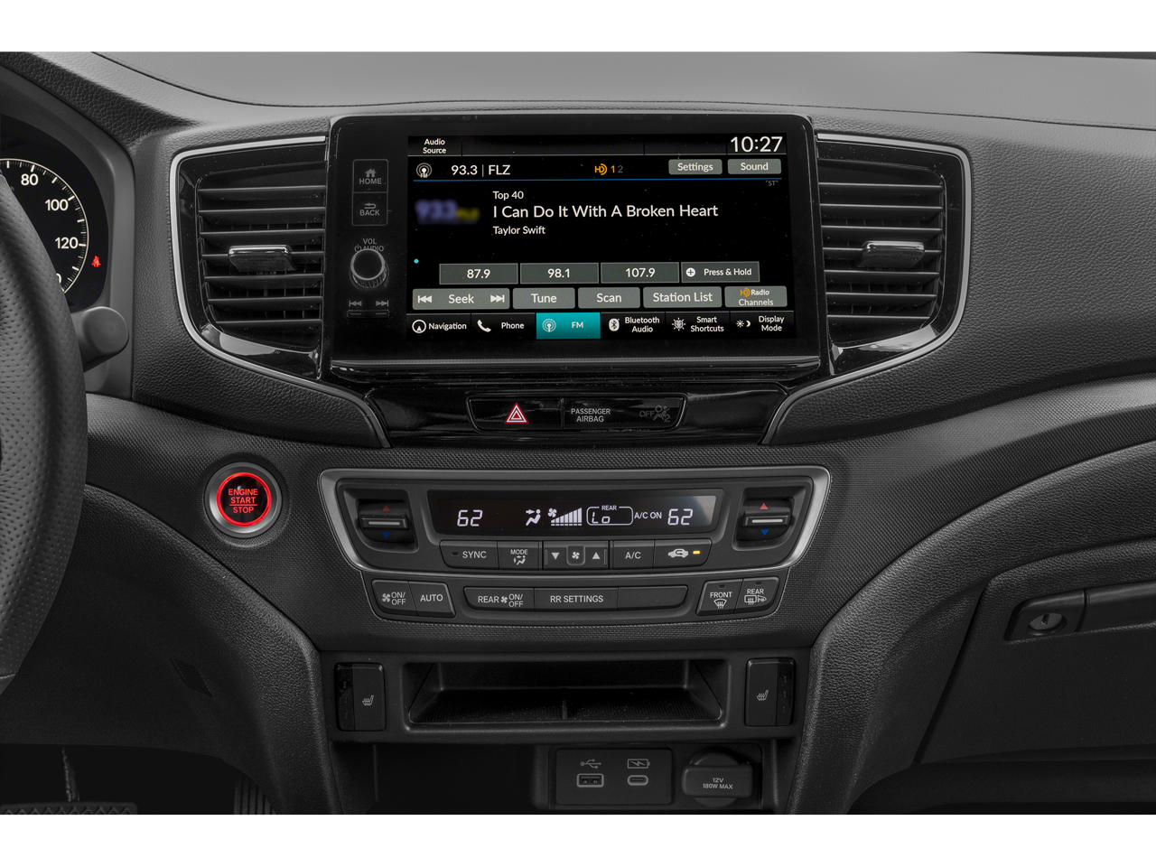 • Radio: 215-Watt Audio System w/7 Speakers -inc: subwoofer, 9" color touchscreen, Bluetooth® streaming audio, Speed-Sensitive Volume Compensation (SVC), wireless Apple CarPlay/Android Auto compatibility, HD Radio, 2.5A USB-A data port in front console and HondaLink